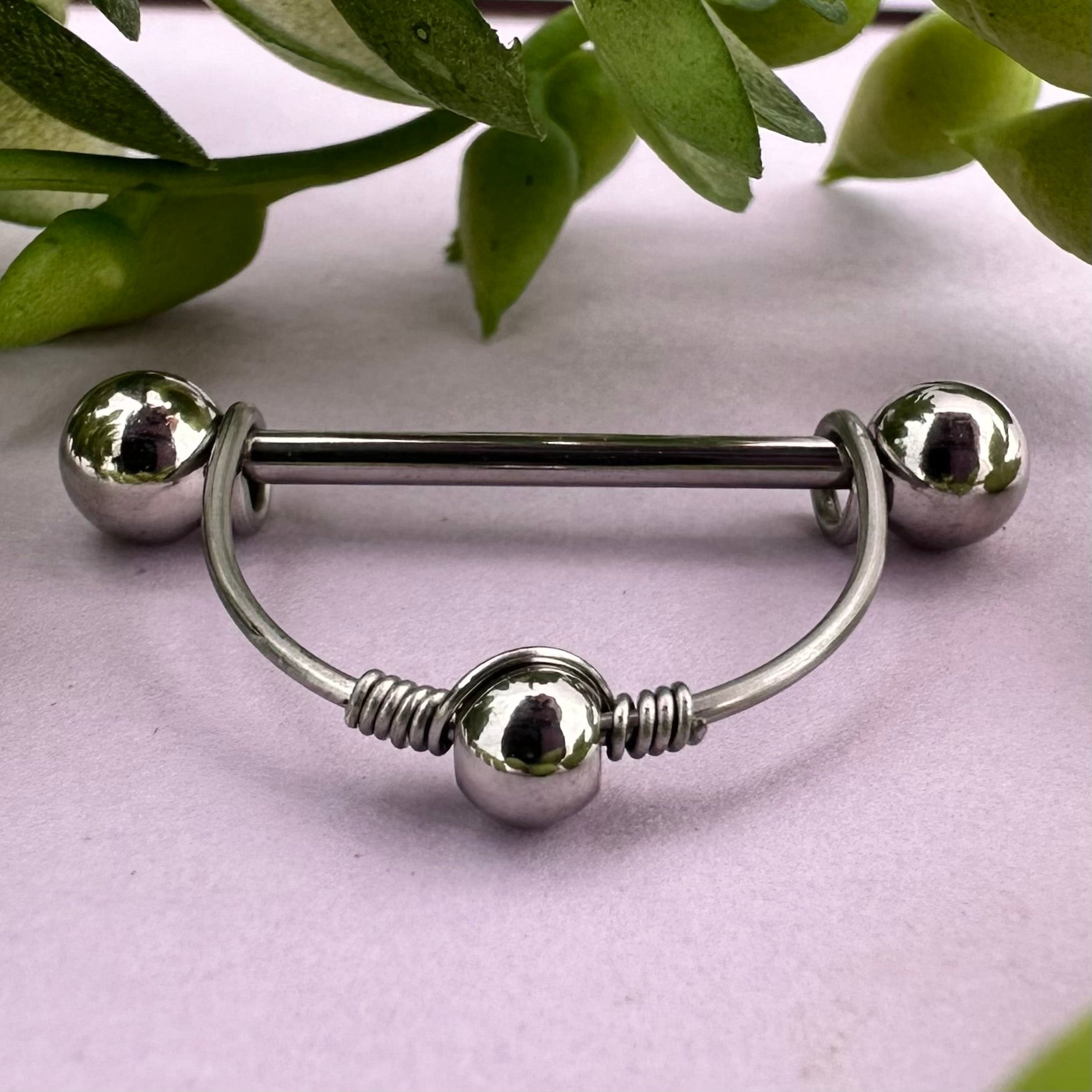 Hand made nipple shield, with a stirrup shield and wrapped metal bead. The shield is removable and reversible with a smooth front and back. This is made with real high quality materials, no mystery metal!