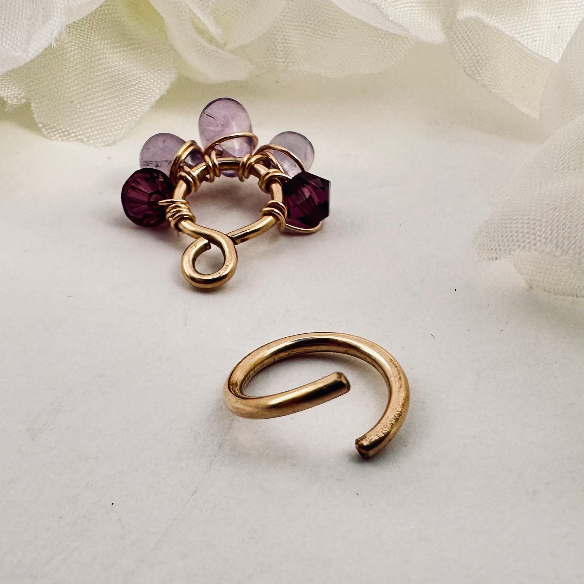 Hand made flexible dangle belly ring full of mystical healing properties and sparkles! You can wear with the dangle or remove for just the hoop, with customized crystals and gemstones. It resembles a tiny dreamcatcher!