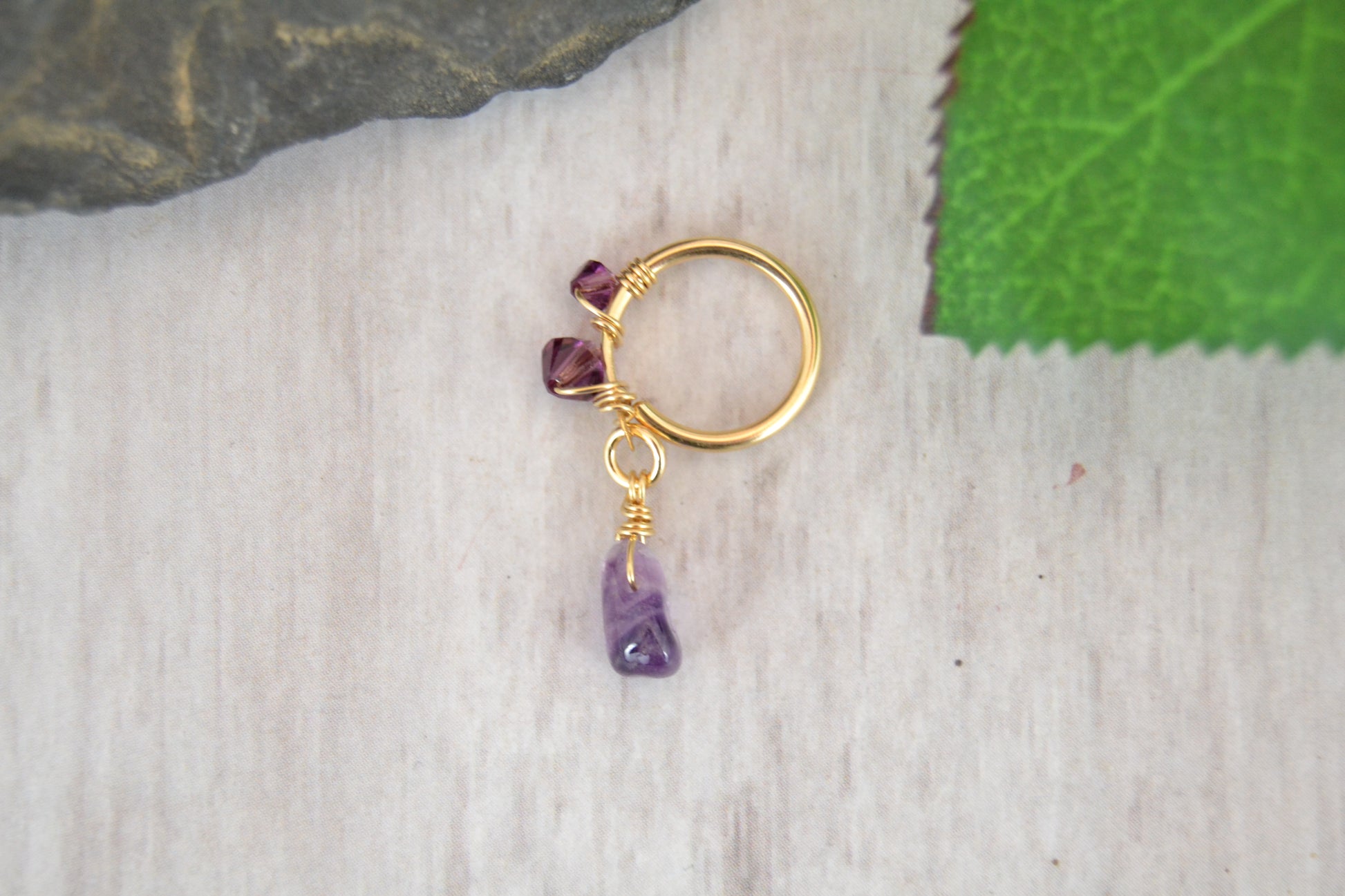 This hand made conch hoop earring is inspired by the natural healing of nature. The opening utilizes a flexible hoop, with matching wire wrapped around dazzling Swarovski crystals and a genuine gemstone. Wearable on the left or right ear.