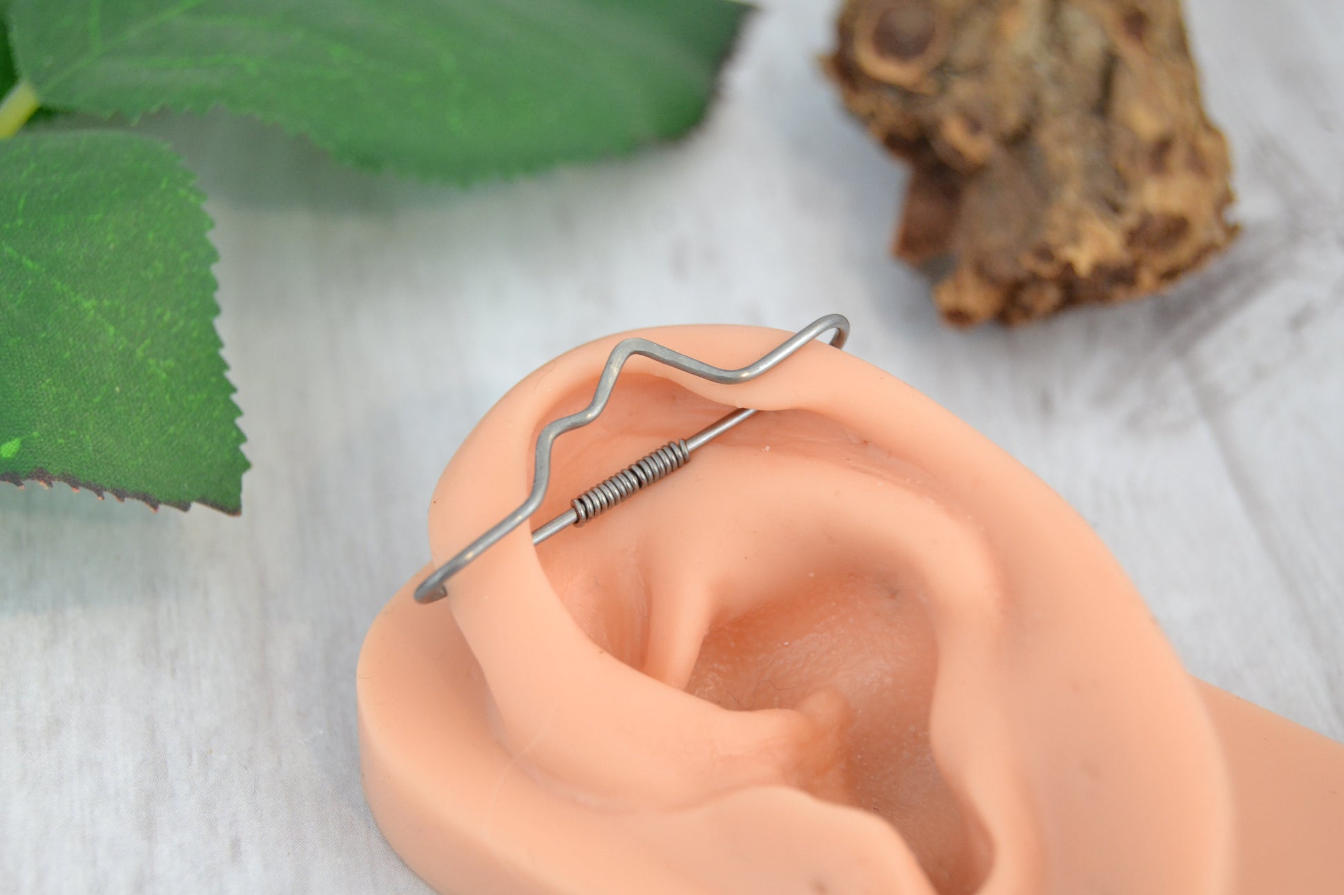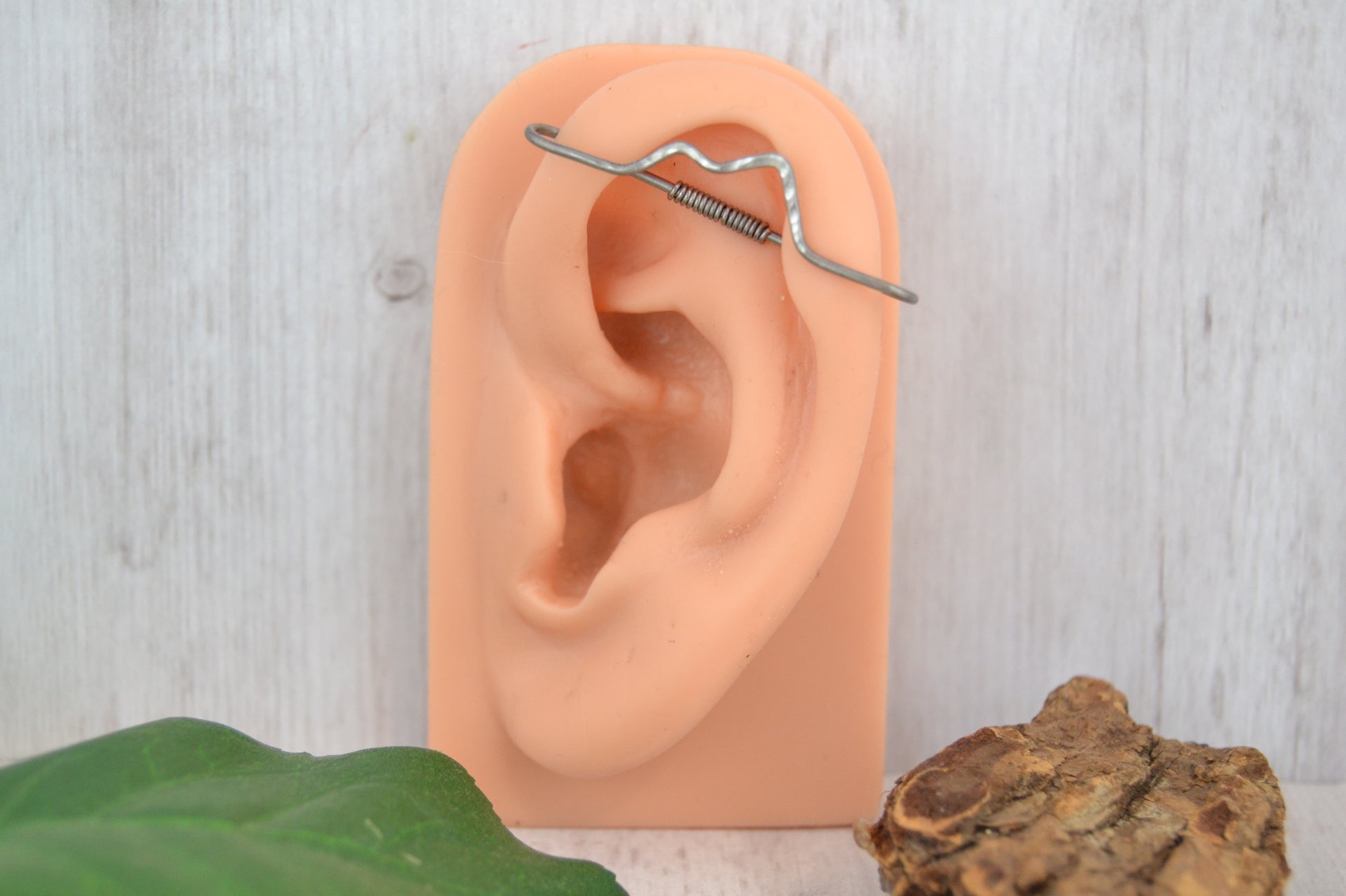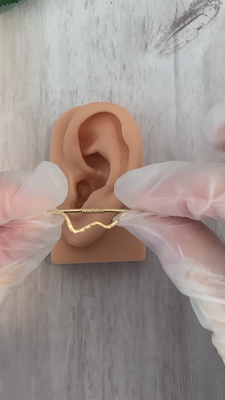 How to wear this: Slide coil to the side, twist sideways at the seam (not apart widely!), remove coil, insert the "hook" ends through each piercing hole one at a time, slide the coil back on, twist the seam sideways to close, move the coil over the seam.